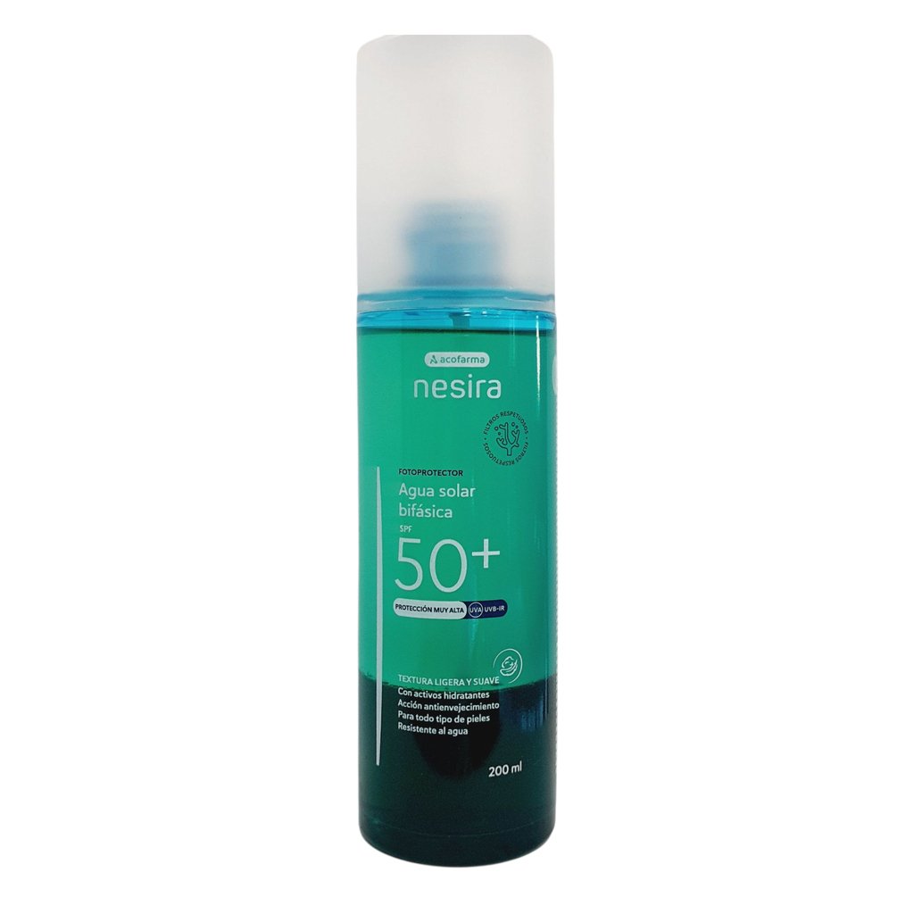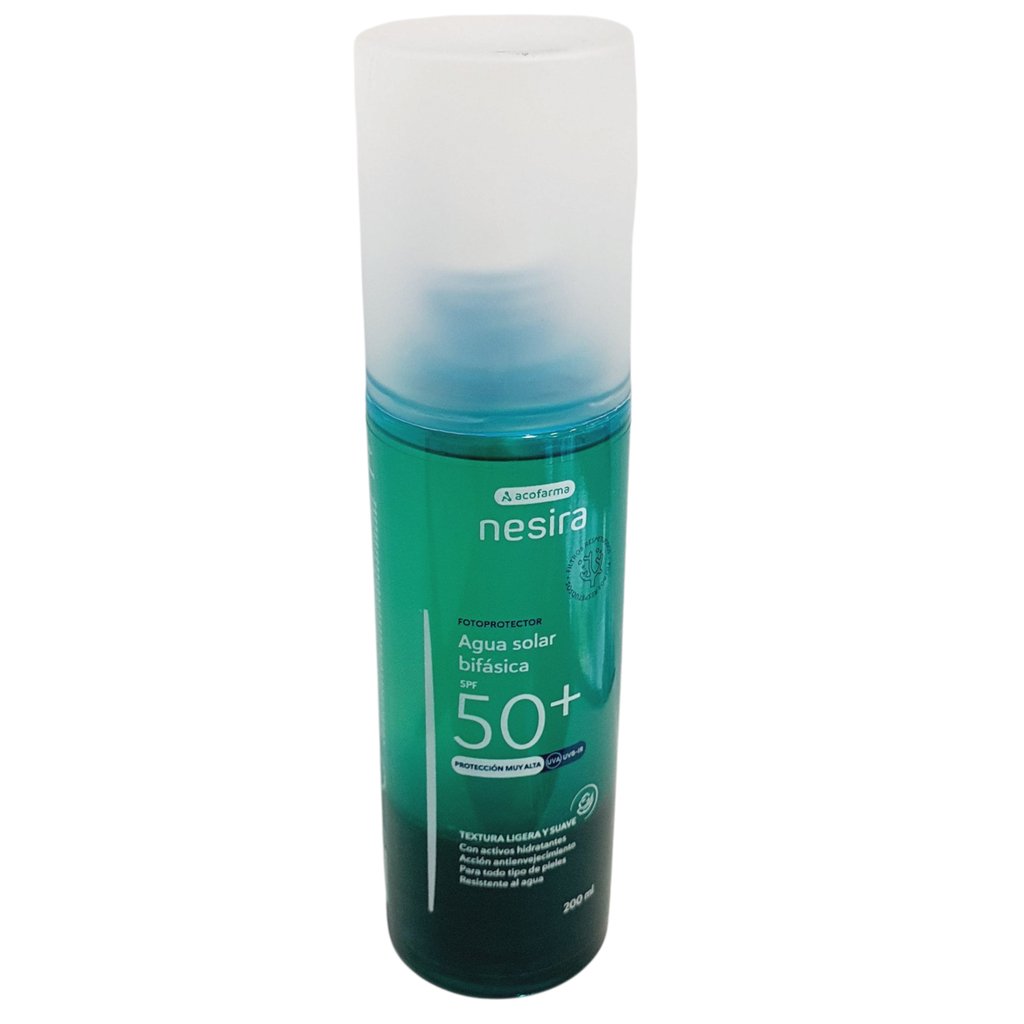 El Agua Solar Bifásica SPF 50+ Nesira Acofarma es un protector solar muy popular en España, conocido por su innovadora fórmula bifásica que combina los beneficios del agua y el aceite.