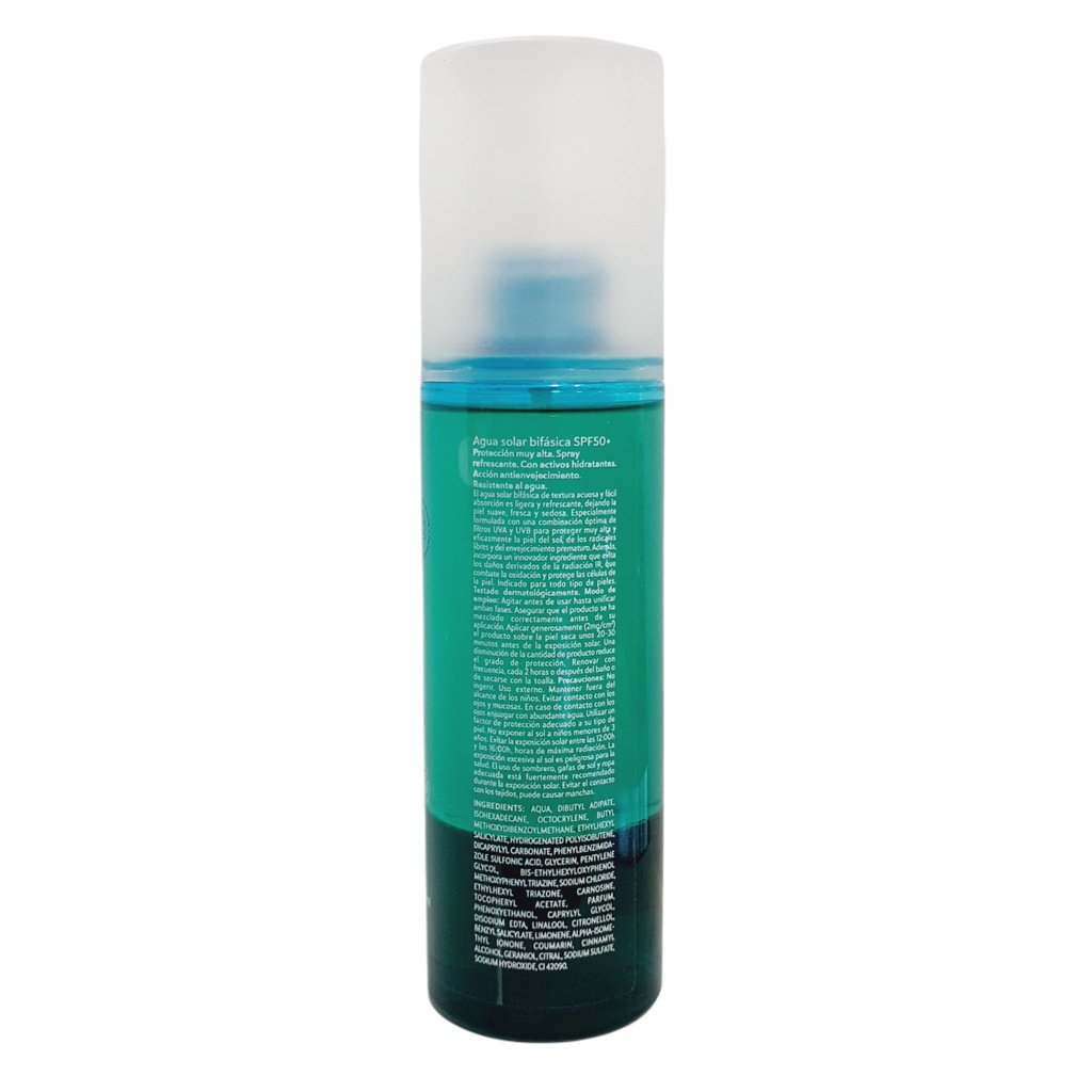 El agua solar bifásica de textura acuosa y fácil absorción es ligera y refrescante. dejando la piel suave, fresca y sedosa. Especialmente formulada con una combinación óptima de filtros UVA y UVB para proteger muy alta y eficazmente la piel del sol, de radicales libres y del envejecimiento prematuro. Además, incorpora un innovador ingrediente que evita los daños derivados de la radiación IR, que combate la oxidación y protege las células de la piel.