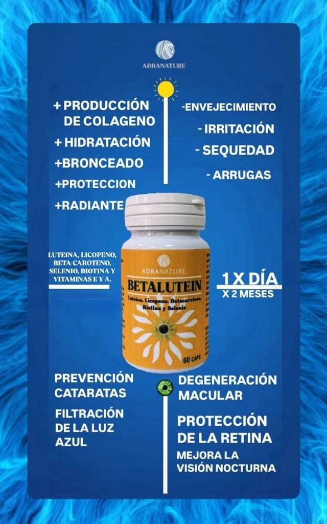 Complemento alimenticio a base de Vitamina E, Luteína, Licopeno, Beta-Caroteno (Vitamina A), Selenio y Biotina. Para la prevención de cataratas y la filtración de la luz azul, degeneración muscular, ayuda a la producción de mas colágeno, hidratación, bronceado, proteccion, radiante, reduce el envejecimiento, irritación, sequedad, arrugas.