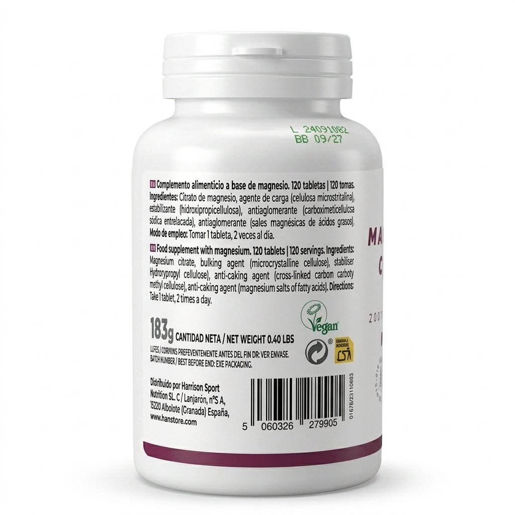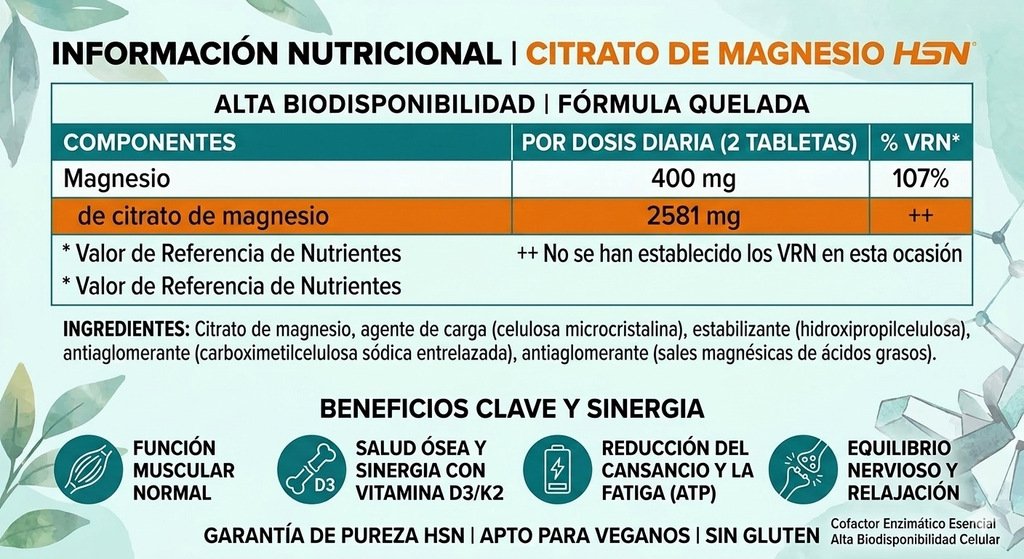 Optimiza tu bienestar con el Citrato de Magnesio de HSN, un complemento alimenticio diseñado bajo estándares de pureza farmacéutica. A diferencia del óxido de magnesio, nuestra fórmula de sal orgánica garantiza una absorción superior, actuando como un cofactor enzimático esencial en más de 300 reacciones biológicas.