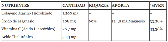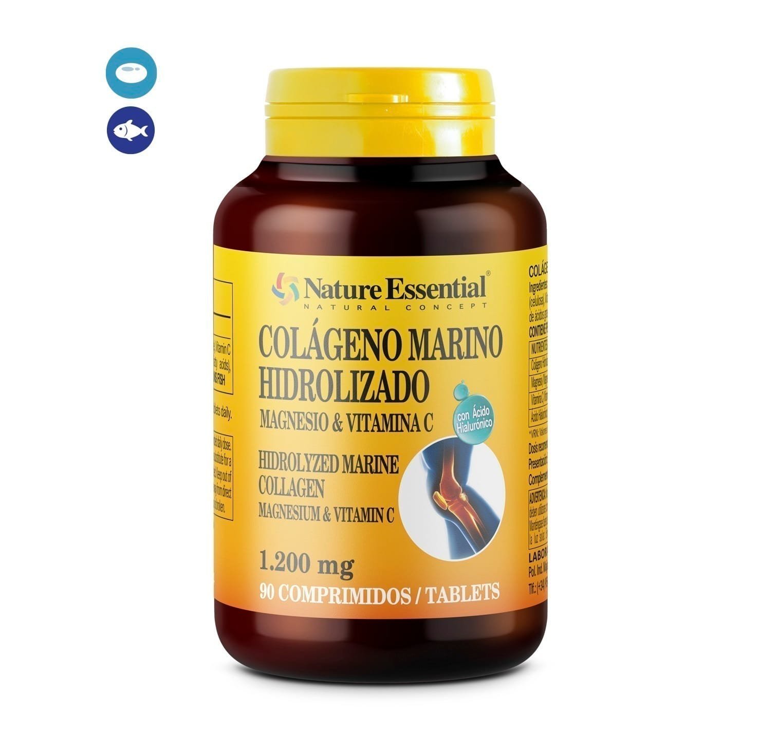 - Colágeno Marino Hidrolizado (1200 mg por comprimido): Se absorbe mejor por el organismo. El colágeno es la proteína esencial de diversos tejidos conectivos.