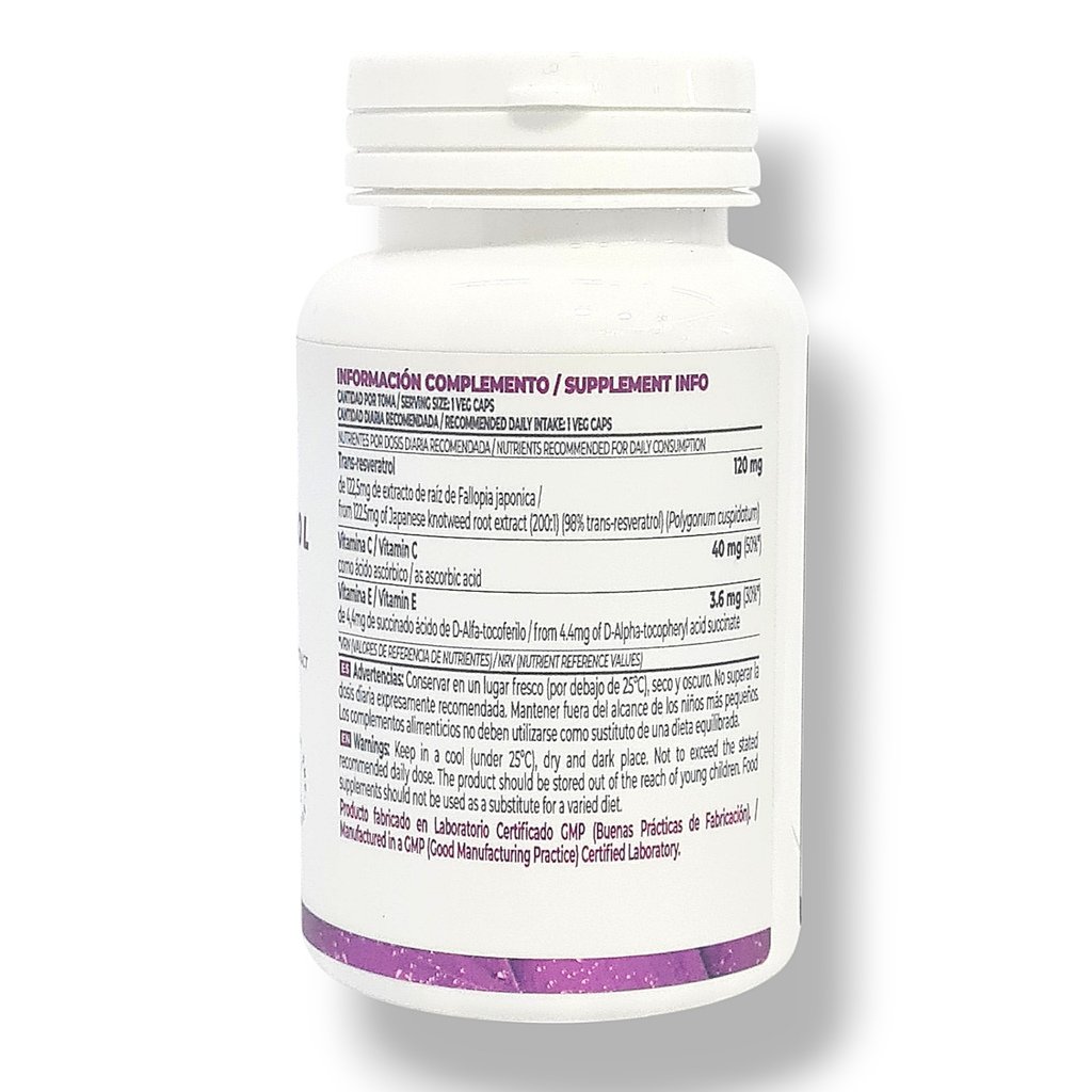 - Trans-Resveratrol: 120 mg de 122,5 mg de extracto de raiz de Fallopia Japónica 200:1.